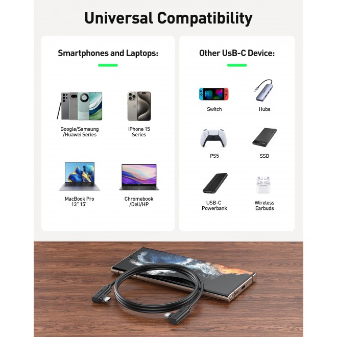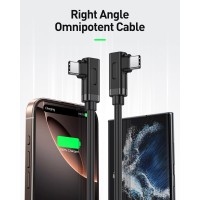 Features 90° angled connectors on both ends for a flush fit in tight spaces, reducing strain on device ports. Ideal for gaming, in-car charging, and bedside use.