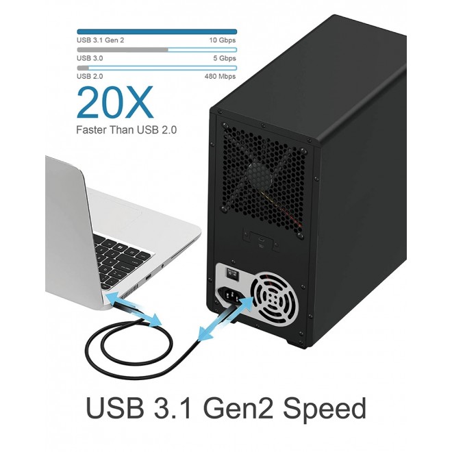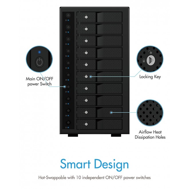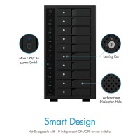 Comfortable setup The IB-3810-C31 offers convenient functions: Enjoy the trayless hard disk installation with Plug & Play and HotSwap function and the energy-saving standby mode. LEDs provide information on operation and hard disk access. USB 3.1 (Gen 2) interfaces with UASP support apply to all 10 hard drive bays of this SINGLE system, as well as the operation of hard drives without any capacity restrictions.