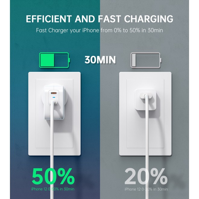 The USB c charger with 2 port 20W PD 3.0 & QC 3.0 power delivery ports, rapid charger two devices simultaneously, which can shorten the time and save outlet place when have to charger to the device