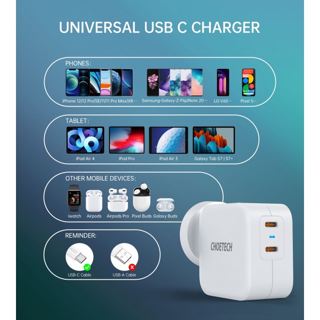 CHOETEH Dual USB C Wall Charger can provide a fast charge for Type-C phones and tablets, such as the latest iPhone 12, 12 pros, 12 pro max, 12 mini, 2018 iPad Pro 11/12.9, 2020 iPad Pro 11/12.9, Samsung Galaxy S20, S20+, S10, S10+, S9, S9+ Plus, S8, S8+ Plus / Active, A70, A80, Google Pixel 3/3XL/4/4XL, Pixel 3A, LG G7 Thing, G8, G6, G5, Stylo 4, V20, V30, V35, V30S, V40 ThinQ Plus, Motorola Moto Z and more