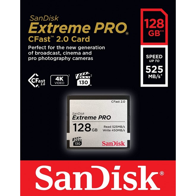 The SanDisk Extreme PRO® CFast™ 2.0 memory card delivers the high performance that broadcast, cinema, and photography professionals demand today. The card features a Video Performance Guarantee of 130MB/s (VPG 130) which enables cinema-quality 4K video recording (4096x2160p). And its write speeds of up to 450MB/s and data transfer speeds of up to 525MB/s provide extreme workflow efficiency. Our second generation CFast card, the SanDisk Extreme PRO CFast 2.0 memory card was designed in collaboration with leading-edge camera manufacturers to assure an exceptional user experience from the first shot.