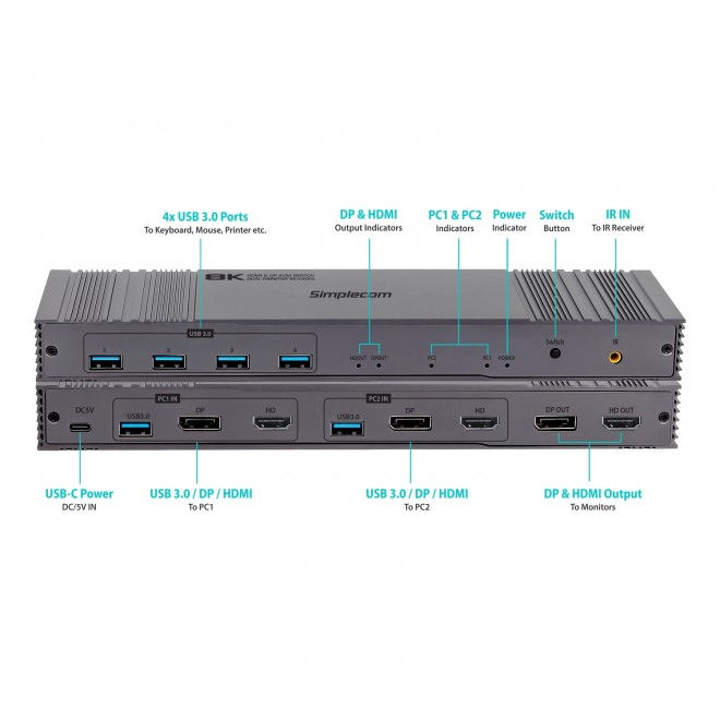Simplecom KM490 HDMI and DisplayPort Dual Monitor KVM Switch for 2 Computers with 4-Port USB 3.0 Hub 5Gbps 8K@60Hz