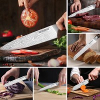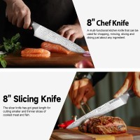 Warmot kitchen knifef set: 1x 8" chef knife, 1 x 8" slicing knife, 1 x 8" bread knife, 1 x 5" santoku knife, 1 x 5.5" serrated utility knife, 1 x 5" utility knife, 1 x 3.5" paring knife, can meet the daily needs of the family such as cutting meat, vegetables,cutting fruit, peeling and other sharp operationsHowever, do not use for cutting hard objects.